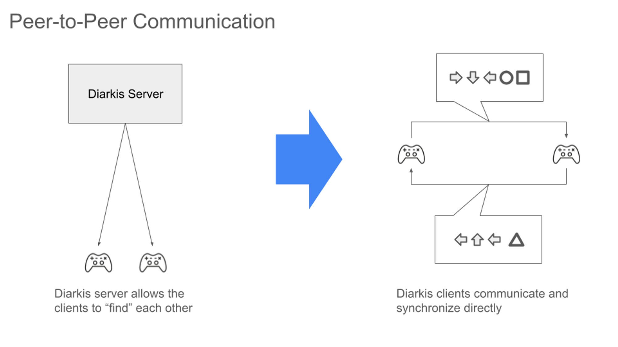 Diarkis P2P は、ユーザー・デバイスがサーバーを介さずに直接通信することを可能にします。